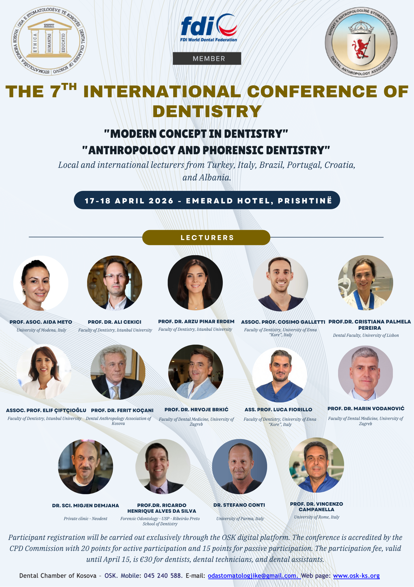The 7th International Dentistry Conference, taking place on April 17–18, 2026, is organized by the Kosovo Chamber of Dentists in cooperation with the Anthropological Dental Association of Kosovo. This international scientific event will bring together dental professionals, researchers, and academics from Kosovo and abroad, with invited lecturers from Turkey, Italy, Brazil, Portugal, and Croatia.