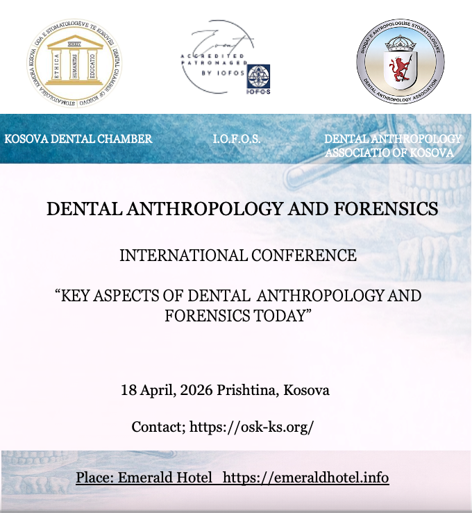 The International Organization for Forensic Odonto-Stomatology (IOFOS) is pleased to grant its official patronage to the session dedicated to Dental Anthropology and Forensic Sciences within the framework of the international conference “Key Aspects of Dental Anthropology and Forensics Today”, to be held on 18 April 2026 in Prishtina, Kosovo.
